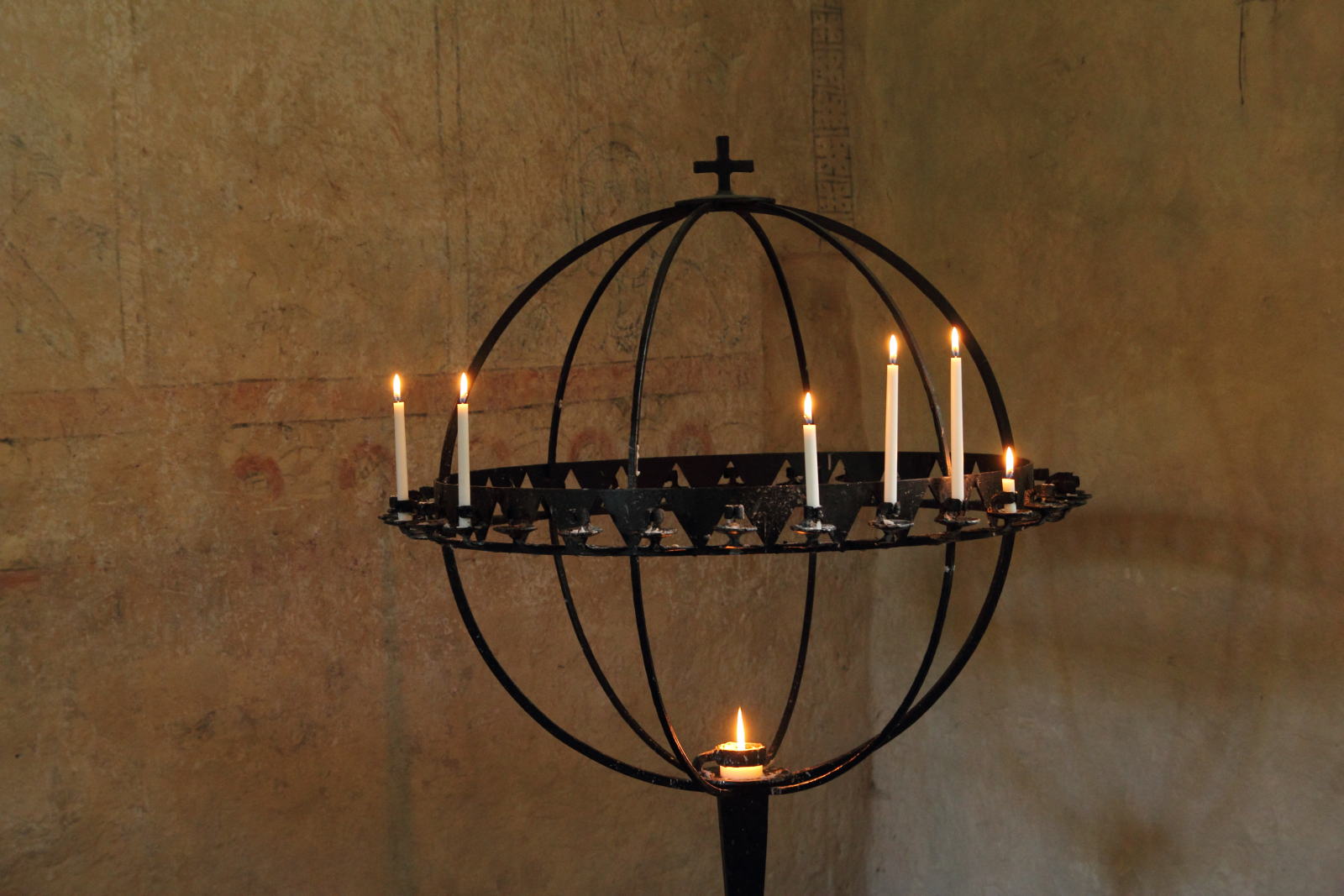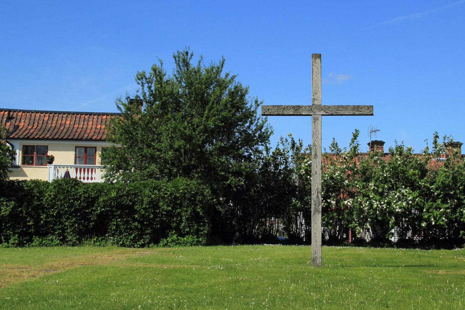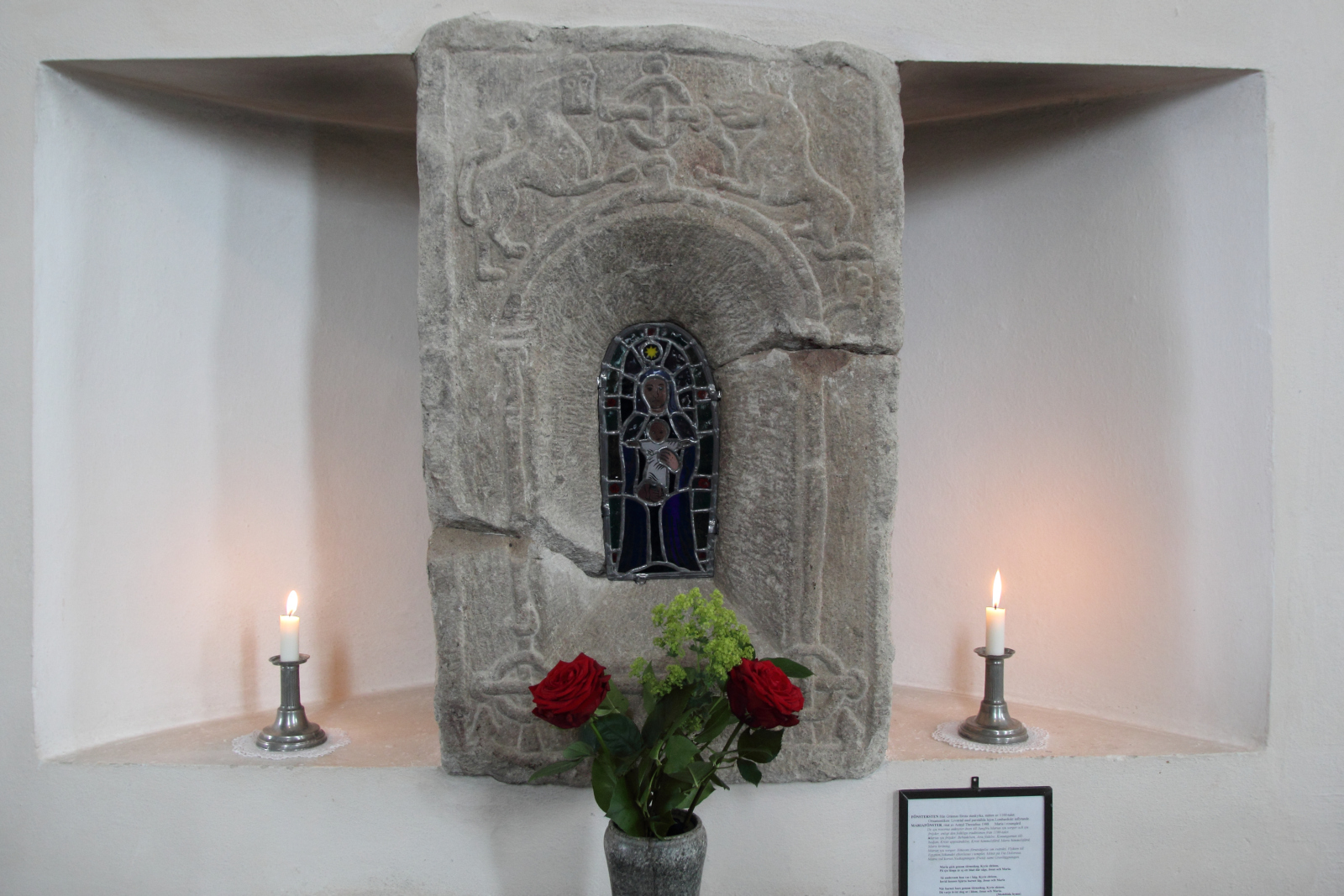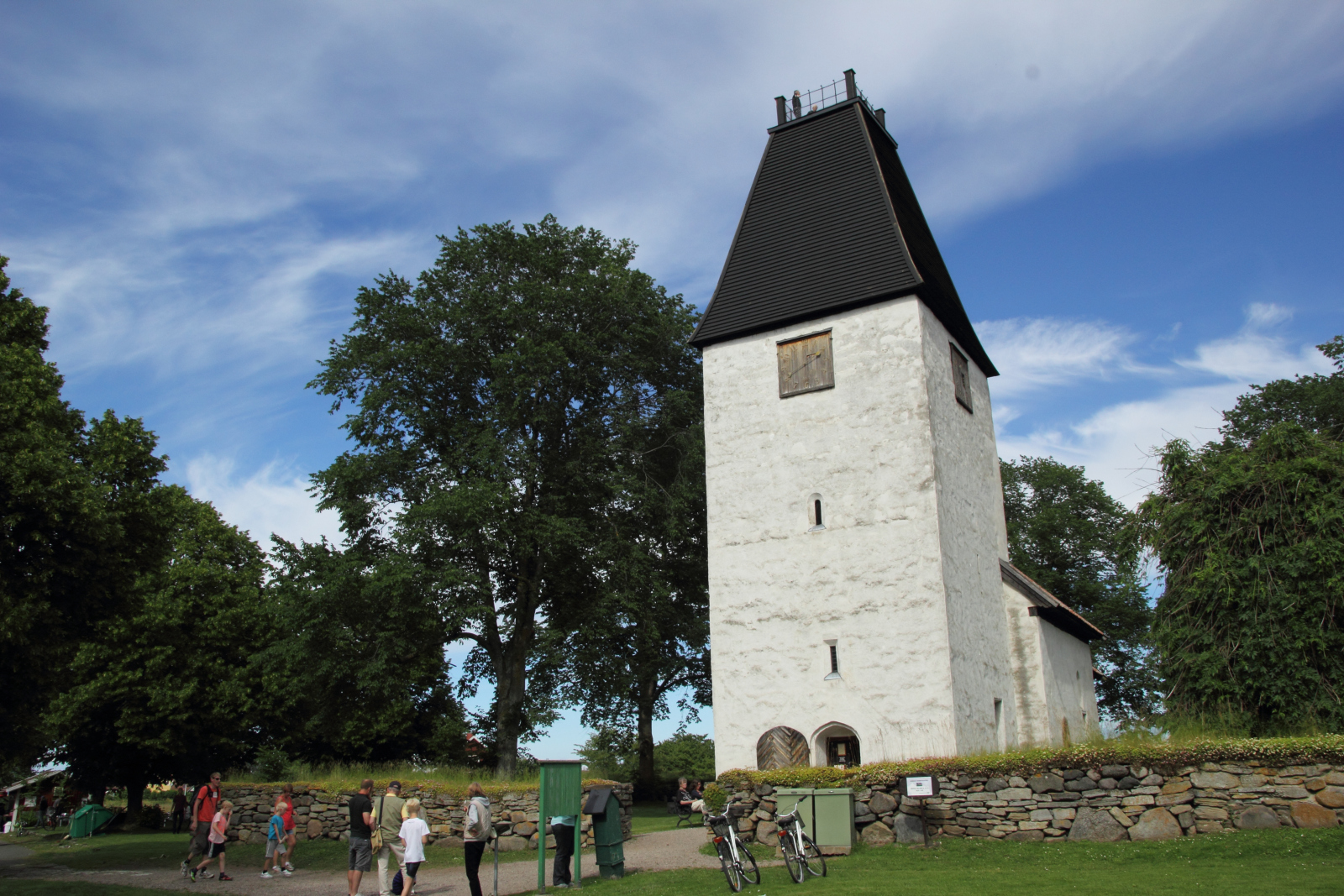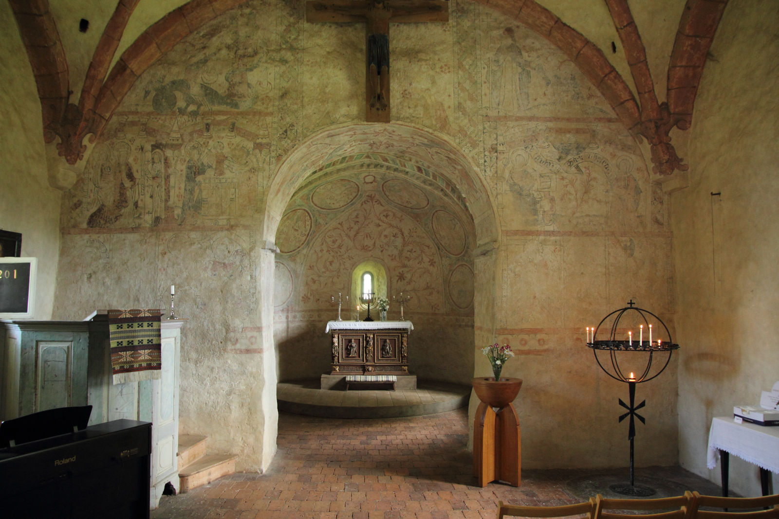 Wir kamen bei der Kirche in Kumlaby vorbei. Sie gehört zu den ältesten Kirchen Schwedens. Um 1135 wurde sie gebaut. Der Kirchturm wurde erst später errichtet, sowie auch die Sakristei. Die Wandmalereien aus dem 15. Jahrhundert wurden überkalkt, 1922 wurde die Kirche restauriert und man versuchte die Malereien wieder freizulegen, jedoch konnten sie nicht vollständig restauriert werden. Bei einigen Malereien kann man aber trotzdem was erkennen: über der Tür zur Sakristei sieht man oben Christus als Heiland und Herrn der Kirche, der die Erde (Ring mit Häusern, Hügeln, Gewässer und Wanderern) in seiner linken Hand hält. Links steht Petrus mit dem Himmelsschlüssel und rechts Moses mit den Hörnern des Heils. Im Chorraum befindet sich auf auch eine sternenförmige Schale, die Piscina. In diese Schale, die in den Kirchengrund mündete, goss man übriggebliebenes Tauf- und Weihwasser sowie nach Spülung der Abendmahlsgeräte das Spülwasser. Wenn man nun vom Chorraum Richtung Kirchenschiff schaut sieht man auf dem Bogen die 10 Jungfrauen, die 5 klugen mit Feuer und die 5 törrichten ohne.
