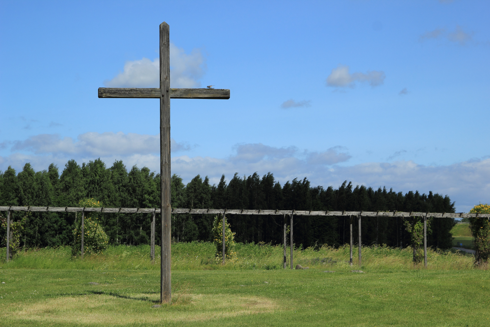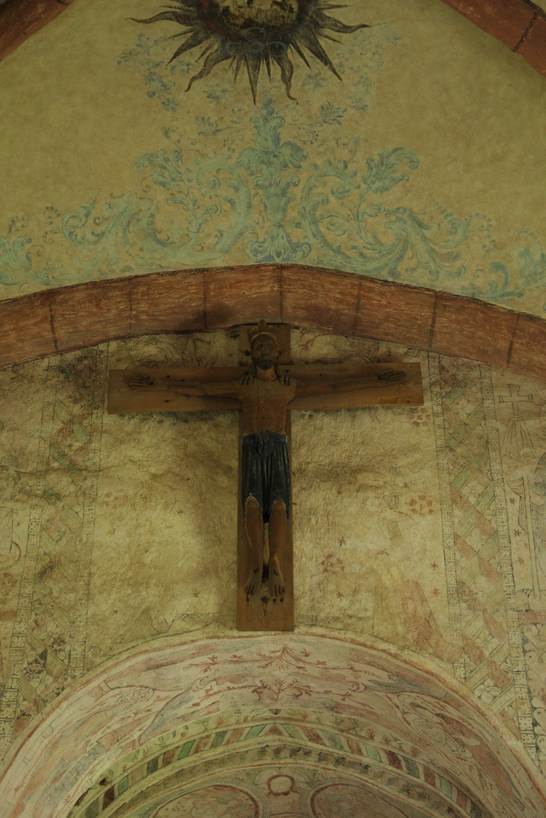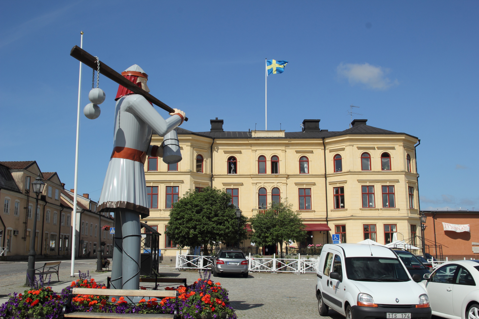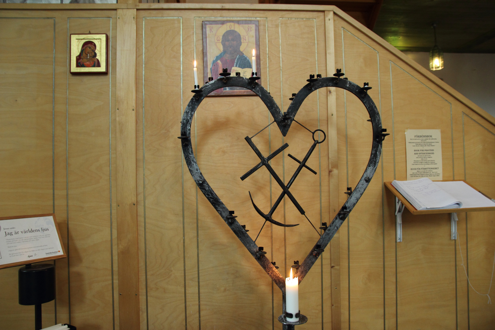 Wir kamen bei der Kirche in Kumlaby vorbei. Sie gehört zu den ältesten Kirchen Schwedens. Um 1135 wurde sie gebaut. Der Kirchturm wurde erst später errichtet, sowie auch die Sakristei. Die Wandmalereien aus dem 15. Jahrhundert wurden überkalkt, 1922 wurde die Kirche restauriert und man versuchte die Malereien wieder freizulegen, jedoch konnten sie nicht vollständig restauriert werden. Bei einigen Malereien kann man aber trotzdem was erkennen: über der Tür zur Sakristei sieht man oben Christus als Heiland und Herrn der Kirche, der die Erde (Ring mit Häusern, Hügeln, Gewässer und Wanderern) in seiner linken Hand hält. Links steht Petrus mit dem Himmelsschlüssel und rechts Moses mit den Hörnern des Heils. Im Chorraum befindet sich auf auch eine sternenförmige Schale, die Piscina. In diese Schale, die in den Kirchengrund mündete, goss man übriggebliebenes Tauf- und Weihwasser sowie nach Spülung der Abendmahlsgeräte das Spülwasser. Wenn man nun vom Chorraum Richtung Kirchenschiff schaut sieht man auf dem Bogen die 10 Jungfrauen, die 5 klugen mit Feuer und die 5 törrichten ohne.