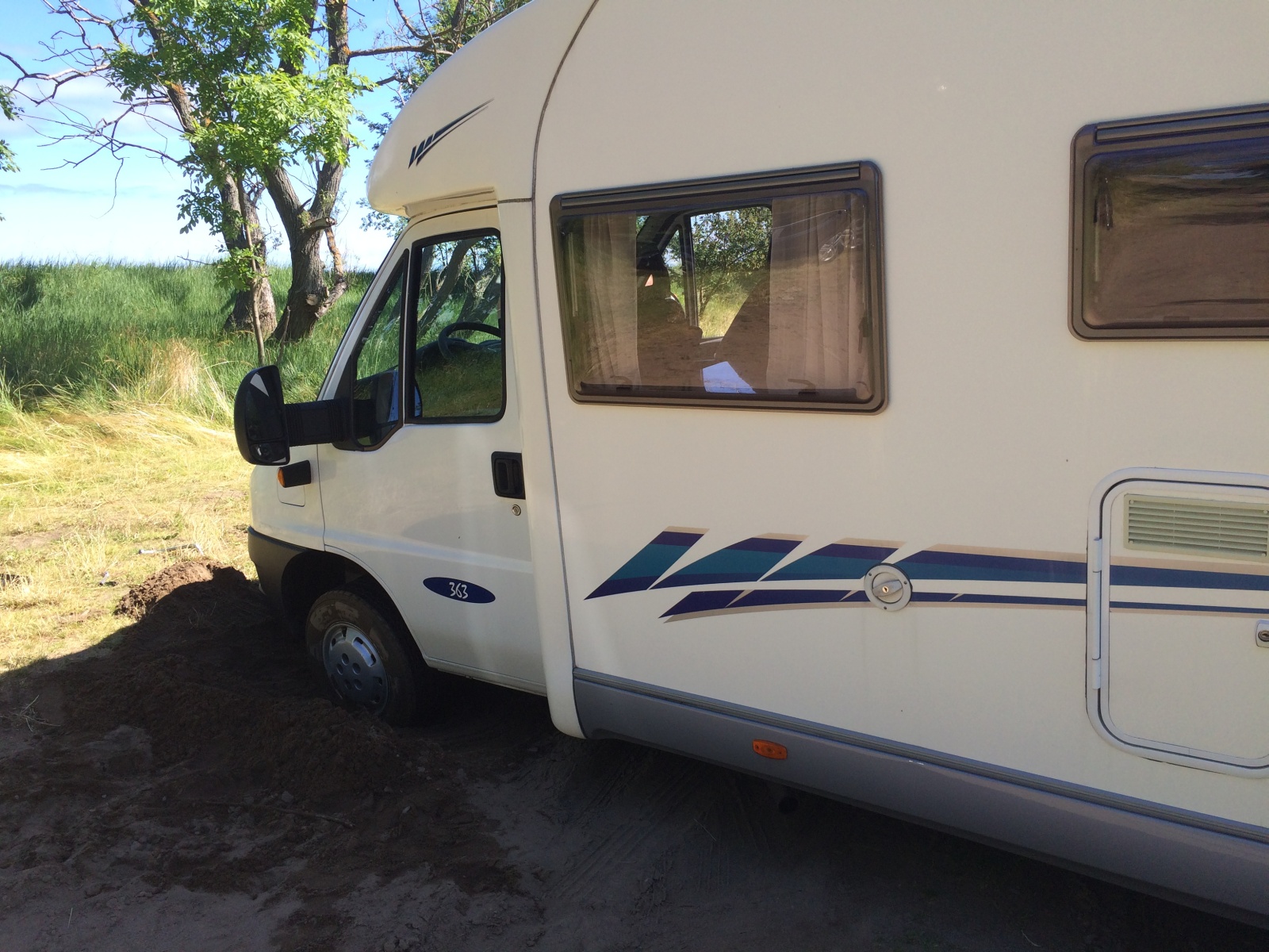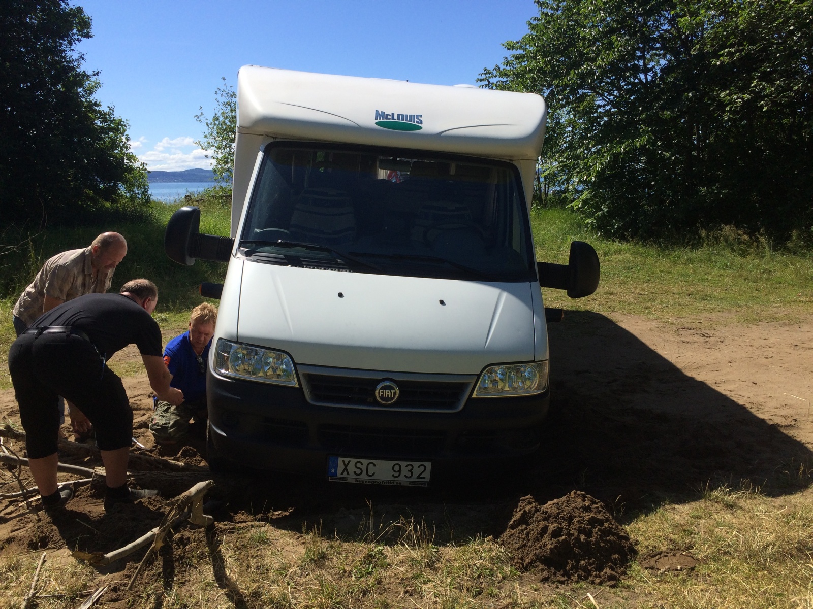 Doch dieser Cache hatte es in sich. Es war ein wunderschöner Sandstrand mit Möglichkeit zum Baden, doch dies musste noch etwas warten. Nachdem Marc den Cache gefunden hatte und wir zurück beim Auto waren, brauchte ein Wohnmobil unsere, vor allem Marc’s Hilfe. Es steckte ziemlich tief im Sand fest. Weitere Geocacher und Helfer kamen, wie bei einem Geocaching-Event. Folgende Nationalitäten waren Vertreter: Zwei Schweden, ein Holländer, ein US-Amerikaner und ein Schweizer halfen dem schwedischen Ehepaar. Marc konnte aus unserer organgen Kiste einen Engländer (verstellbaren Schraubenschlüssel) und ein Abschleppseil beisteuern.