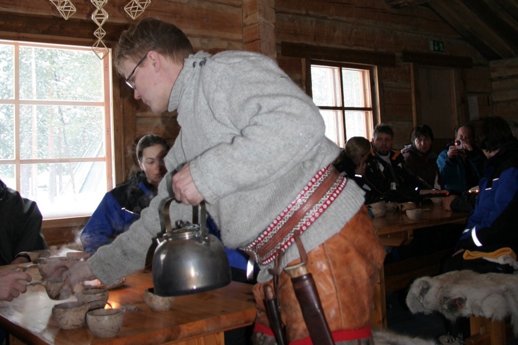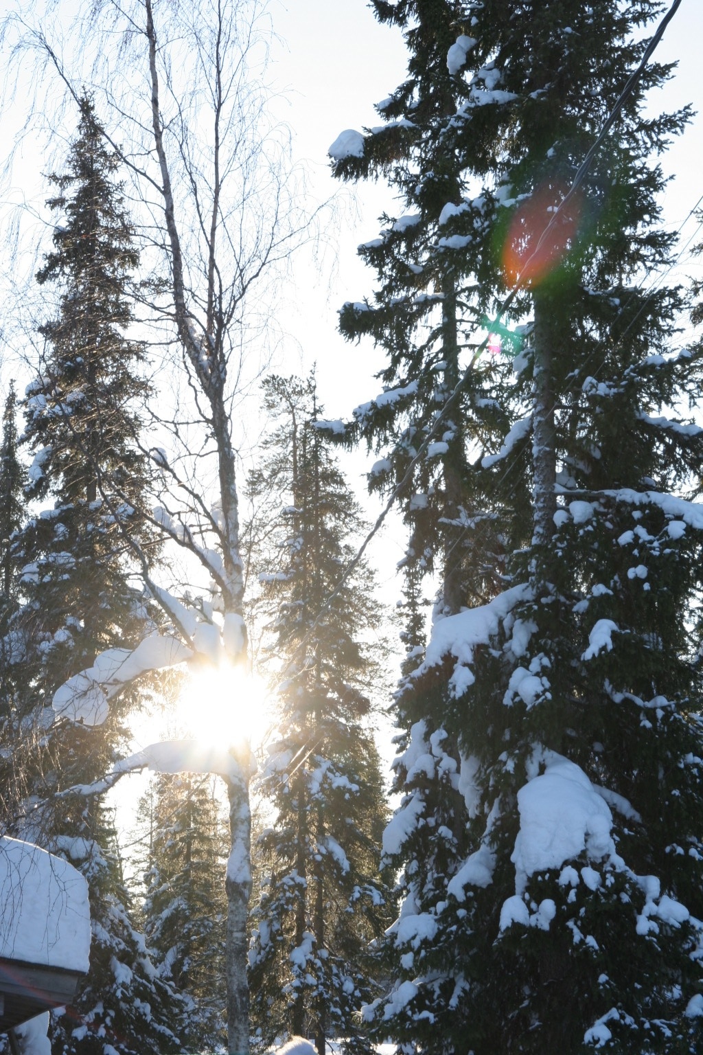 Um 17 Uhr standen wir bereit für den Ausflug ins Aurora Tipy. Wir waren nicht allein und trafen noch vier andere Schweizer und ein deutsches Pärchen. Spannend war zu hören, wer wie wo einquartiert war. Man kann auch in der Blockhütte wohnen und im Hotel essen. Wir waren die einzigen, die selber kochen. Doch was wir von den einen hörten, machte uns nicht gluschtig und wir waren froh über unseren abwechslungsreichen Menuplan. Dann gings mit dem Auto auch schon los, eine halbe Stunde durch die verschneite Landschaft. Beim Lappenzelt „Revontulikota“ angekommen gab es ein Stück Kuchen und Tee, bevor wir in die Welt der Aurora Borealis oder auch Nordlichter genannt abtauchten. Unser Guide erzählte spannend und anschaulich über dieses Phänomen, dass man vor allem hier gut beobachten kann. Interessant waren auch die Sagen und Geschichten aus längst vergangener Zeit. In Finnland gibt es das Märchen, dass Nordlichter entstehen, wenn der Fuchs mit seinem Schwanz Schnee in die Luft befördert. An anderen Orten erzählt man sich, dass eine Frau vom Nordlicht schwanger geworden sei. Es gibt verschiedene Arten von Nordlichtern, das stehende, passive (das haben wir bis jetzt gesehen) und auch ein aktives, das in Form von Strahlen oder tanzend am Himmel erscheint. Wenn man am richtigen Ort steht, kann das Nordlicht auch wie eine Krone sein mit vielen verschiedenen Farben. Fotos und mehr Infos von unserem Guide findet man unter www.sgo.fi (http://www.sgo.fi/~jyrki/jpics.html).