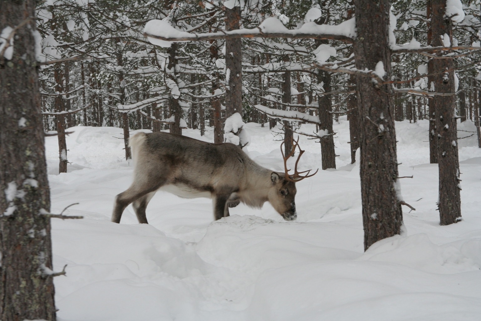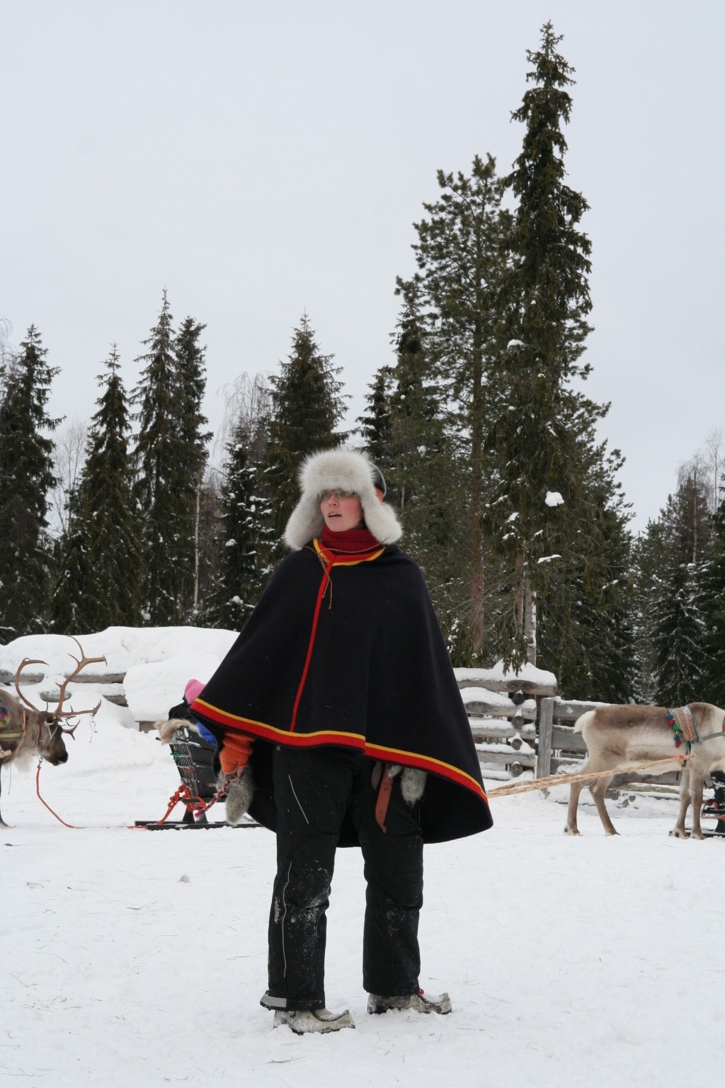 Am Donnerstag war einiges los! Kurz nach dem Mittagessen ging’s zum Snow-Game-Haus. Dort mussten wir uns umziehen und mit Helm bewaffnet Führen wir auf dem Snowmobile zu den Renntieren. Für Karin war die Fahrt nicht so prickelnd, da das Visier angelaufen ist und sie nichts sah und der Fotorucksack verrutschte. Angekommen bei der Renntierfarm wurden wir mit Tee und zopfähnlichem, süssen und nach Kardamom riechendem Brot empfangen. In einem Raum konnten wir uns aufwärmen und der Besitzer der Renntierfarm bewirtete uns und erzählte uns etwas über die finnischen Renntiere. Für ihn fängt das Jahr im Mai/Juni an, da dann die Renntierbabys auf die Welt kommen. Innert einer Stunde können diese schon laufen und nach einem Tag laufen sie schon schneller als wir Menschen. In Finnland wird der Renntierbestand vom Staat reguliert. Es gibt Maximum 200’000 Tiere. Deshalb müssen die Tiere regelmässig gezählt werden und dies geht am besten im Sommer, wenn die Moskitos kommen, da dann die Tiere sich sammeln und als Herde unterwegs ist. Im Innern der Herde werden sie nicht gestochen von den Moskitos, da der Gestank zu intensiv ist. Im Oktober sammeln sich die Tiere wieder, da dann die Paarungszeit ist und die einzige Aufgabe der Weibchen ist, schwanger zu werden. Die überschüssigen Renntiere werden für die Fleischproduktion verwendet. Im November sind die Renntierfarmer im Wald auf der Suche nach ihren Tieren. Sobald der Winter kommt und es mehr als 70cm Schnee hat, sind die Renntiere auf die Fütterung durch die Menschen angewiesen, denn sie finden nichts mehr zu essen.