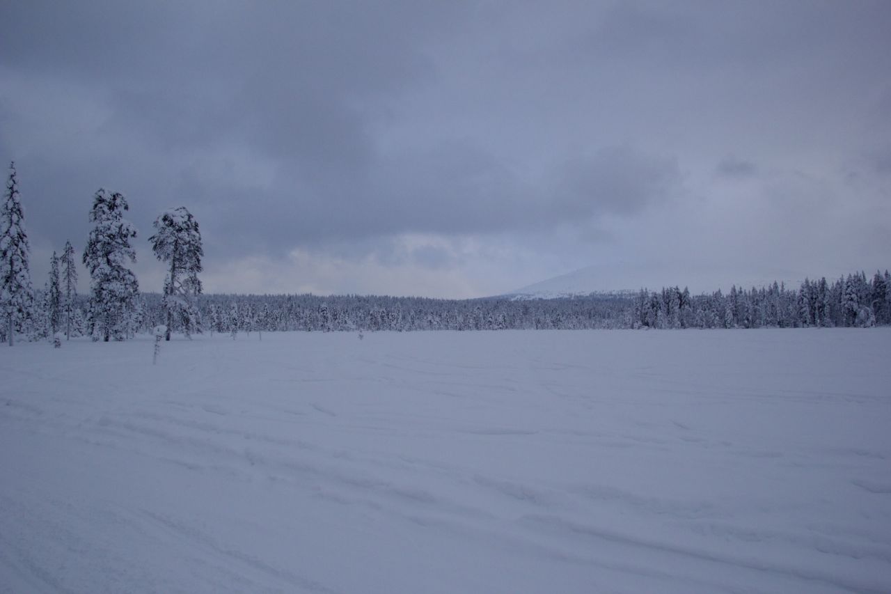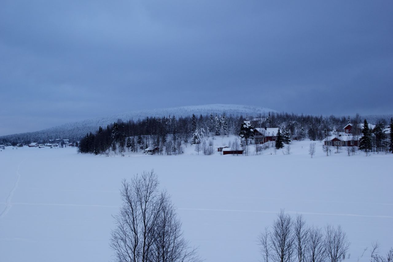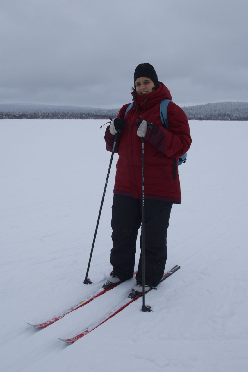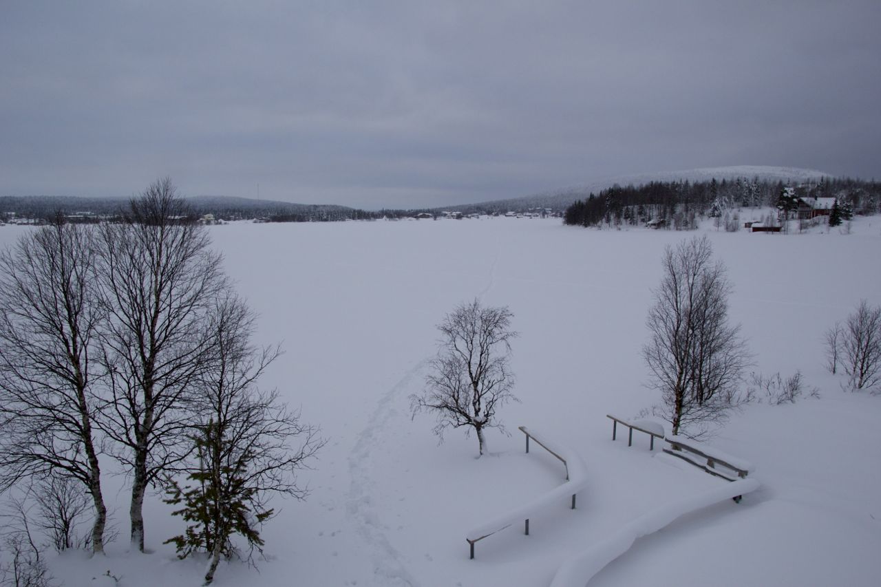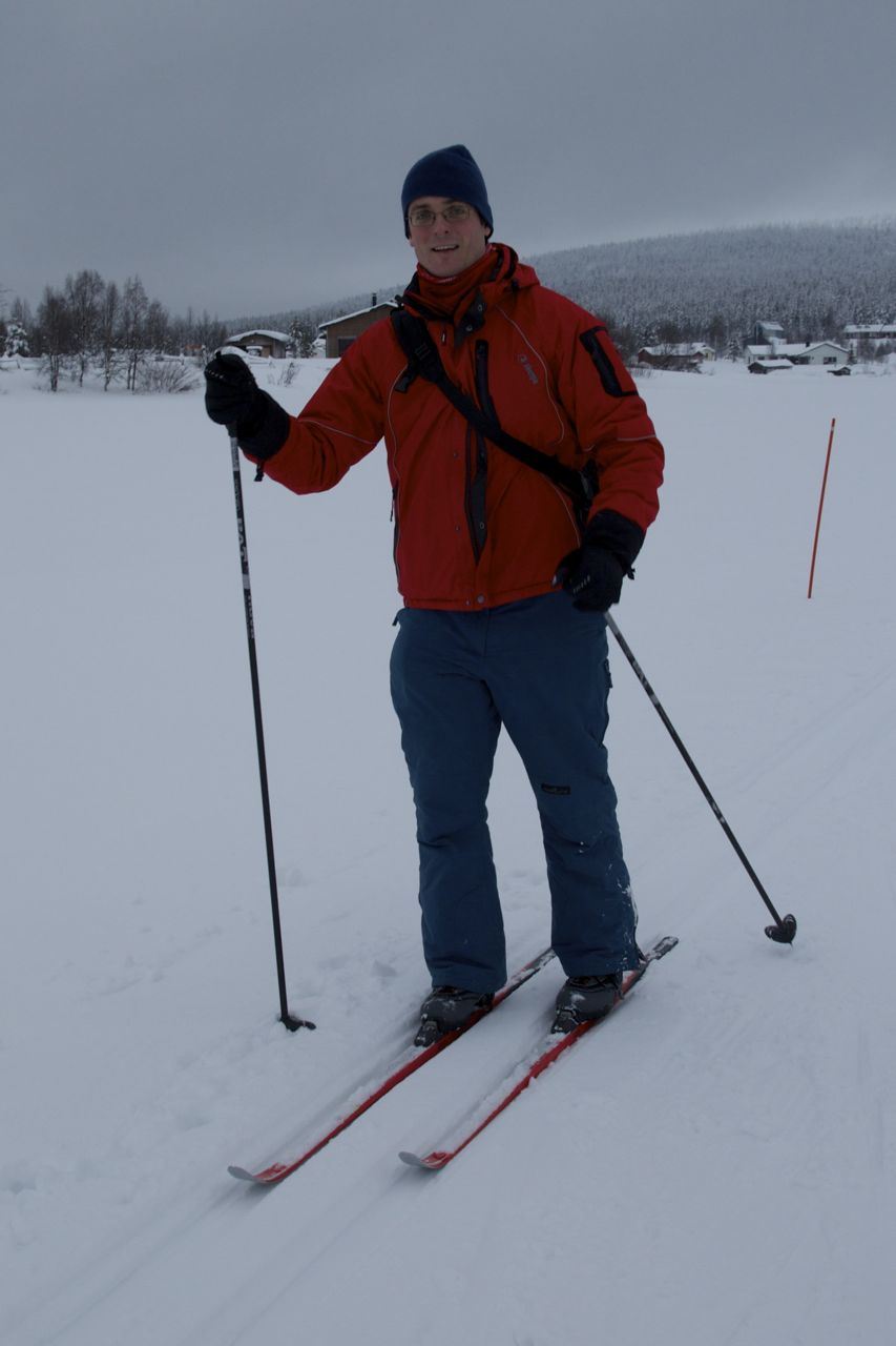Am Nachmittag parkierten wir unser Auto bei der Kapelle und machten uns mit der Langlauf-Ausrüstung auf zum See Äkäslompolo. Dieser Ort hat seinen Namen aufgrund des Sees. Das Dorf ist um den See herum entstanden und im Winter ist dieser gefroren und auf dem Eis hat es eine Schneeschicht mit einer Loipe zum Langlaufen. So fuhren wir eine Runde auf dem See. Dabei kam uns unsere Langlauf-Lehrerin von Montag entgegen und lobte uns und freute sich, dass wir nun auf eigene Faust unterwegs waren. Sie hatte heute ihren freien Tag und war deshalb draussen unterwegs bei diesem schönen Wetter, sagte sie. So schön war das Wetter nicht, so grau war es noch nie, dafür aber nur -2 Grad.