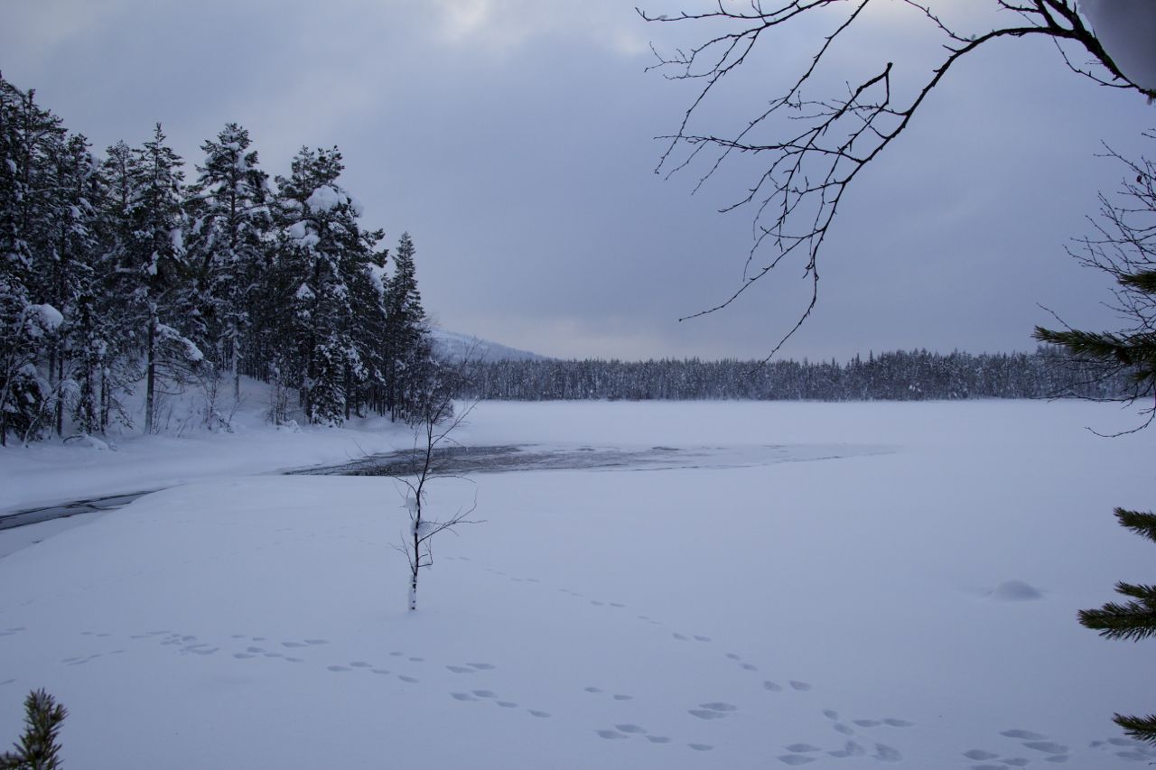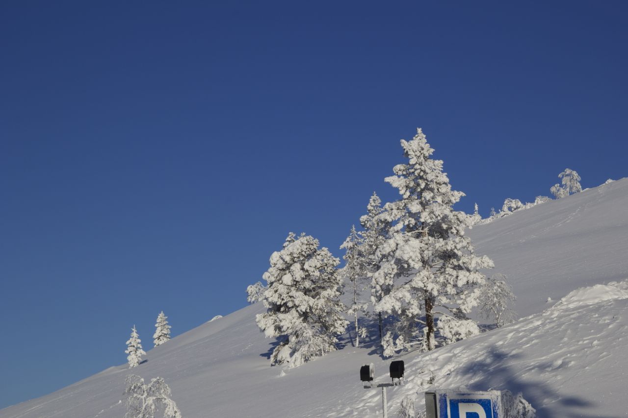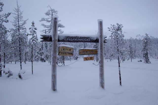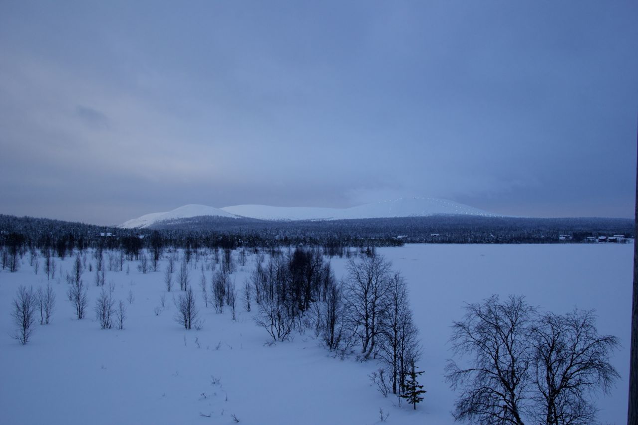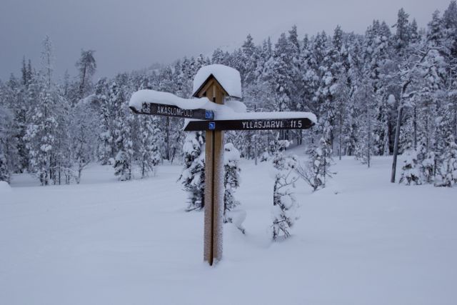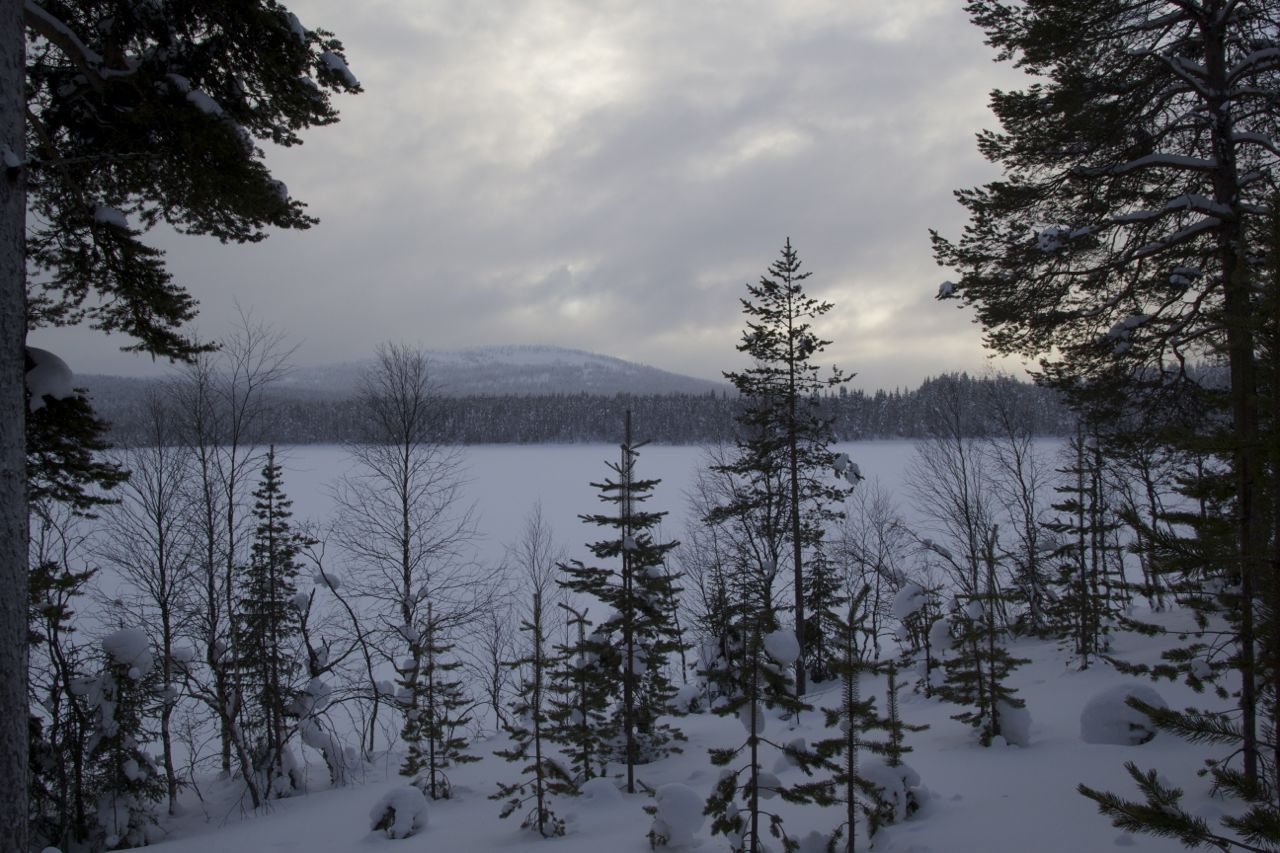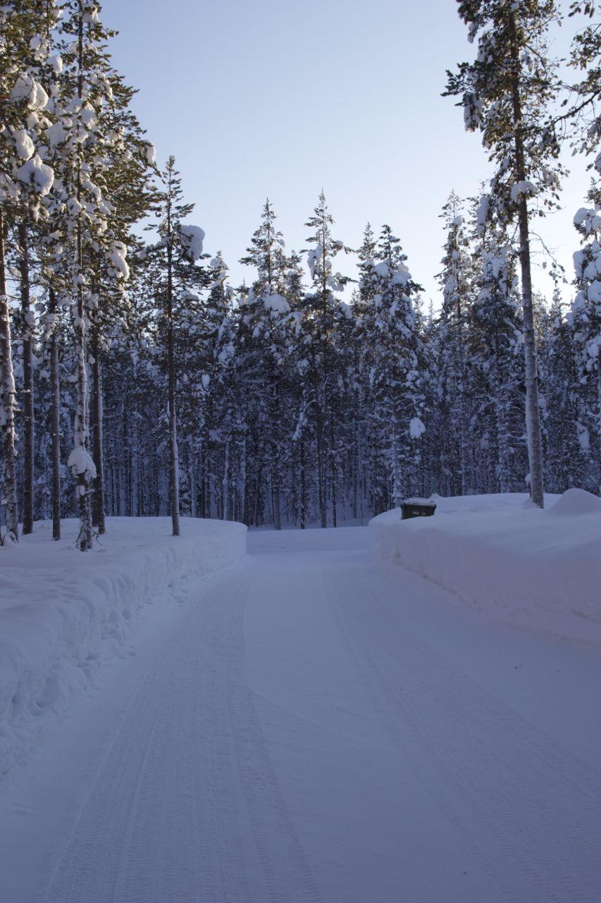 Am Nachmittag parkierten wir unser Auto bei der Kapelle und machten uns mit der Langlauf-Ausrüstung auf zum See Äkäslompolo. Dieser Ort hat seinen Namen aufgrund des Sees. Das Dorf ist um den See herum entstanden und im Winter ist dieser gefroren und auf dem Eis hat es eine Schneeschicht mit einer Loipe zum Langlaufen. So fuhren wir eine Runde auf dem See. Dabei kam uns unsere Langlauf-Lehrerin von Montag entgegen und lobte uns und freute sich, dass wir nun auf eigene Faust unterwegs waren. Sie hatte heute ihren freien Tag und war deshalb draussen unterwegs bei diesem schönen Wetter, sagte sie. So schön war das Wetter nicht, so grau war es noch nie, dafür aber nur -2 Grad.