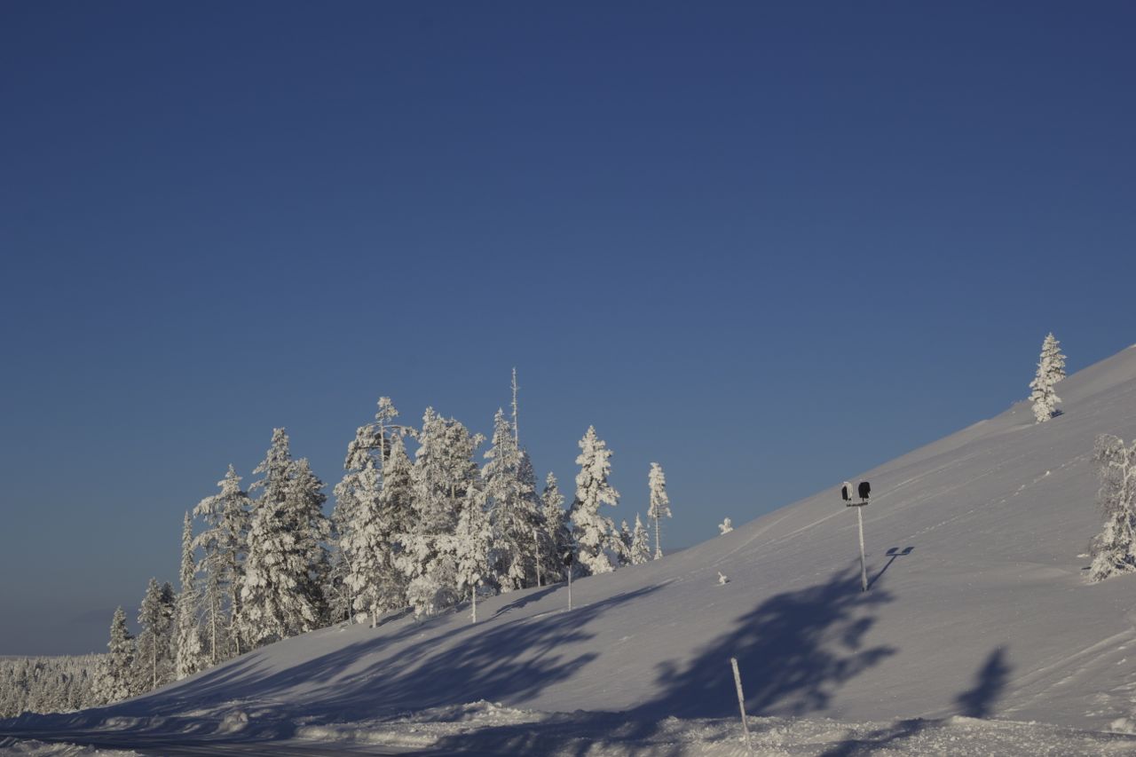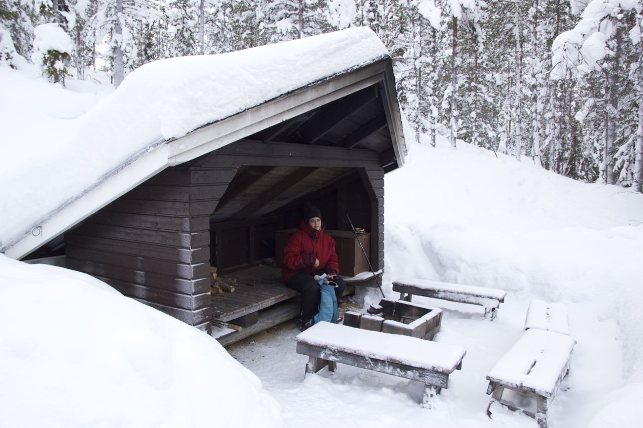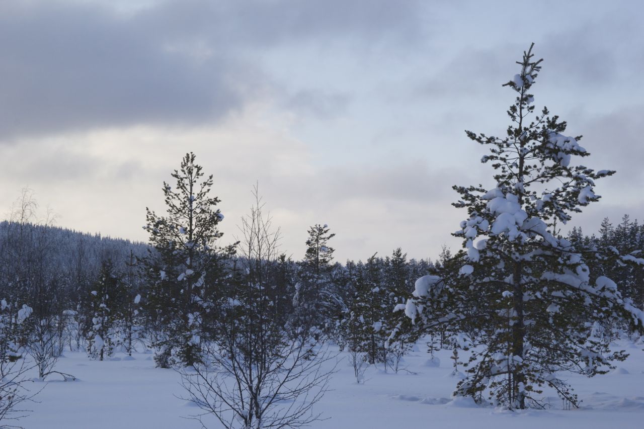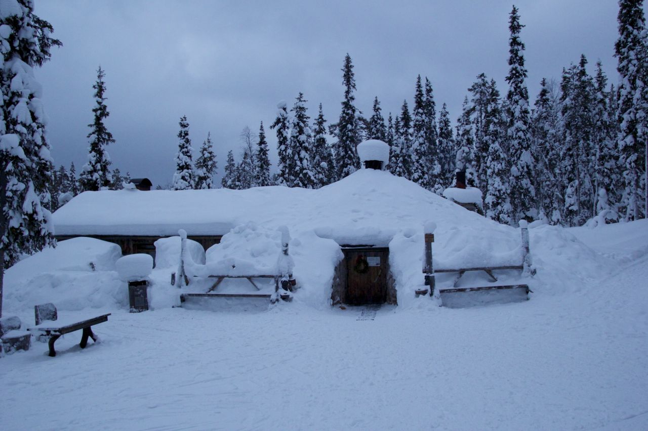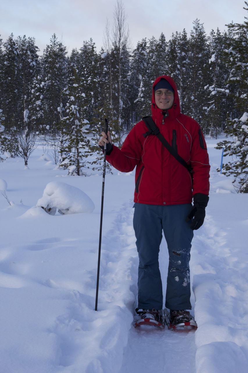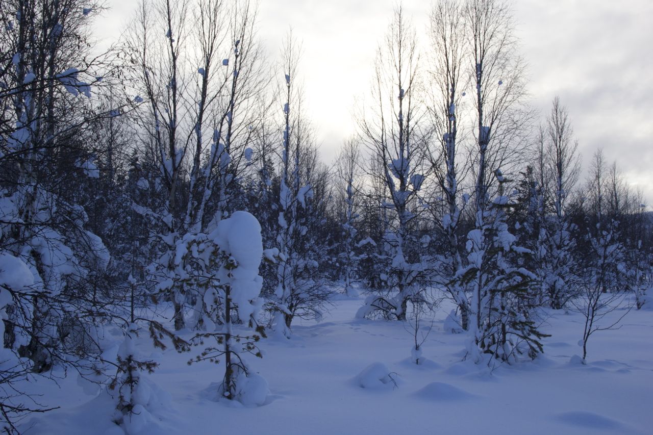 Am Nachmittag parkierten wir unser Auto bei der Kapelle und machten uns mit der Langlauf-Ausrüstung auf zum See Äkäslompolo. Dieser Ort hat seinen Namen aufgrund des Sees. Das Dorf ist um den See herum entstanden und im Winter ist dieser gefroren und auf dem Eis hat es eine Schneeschicht mit einer Loipe zum Langlaufen. So fuhren wir eine Runde auf dem See. Dabei kam uns unsere Langlauf-Lehrerin von Montag entgegen und lobte uns und freute sich, dass wir nun auf eigene Faust unterwegs waren. Sie hatte heute ihren freien Tag und war deshalb draussen unterwegs bei diesem schönen Wetter, sagte sie. So schön war das Wetter nicht, so grau war es noch nie, dafür aber nur -2 Grad.