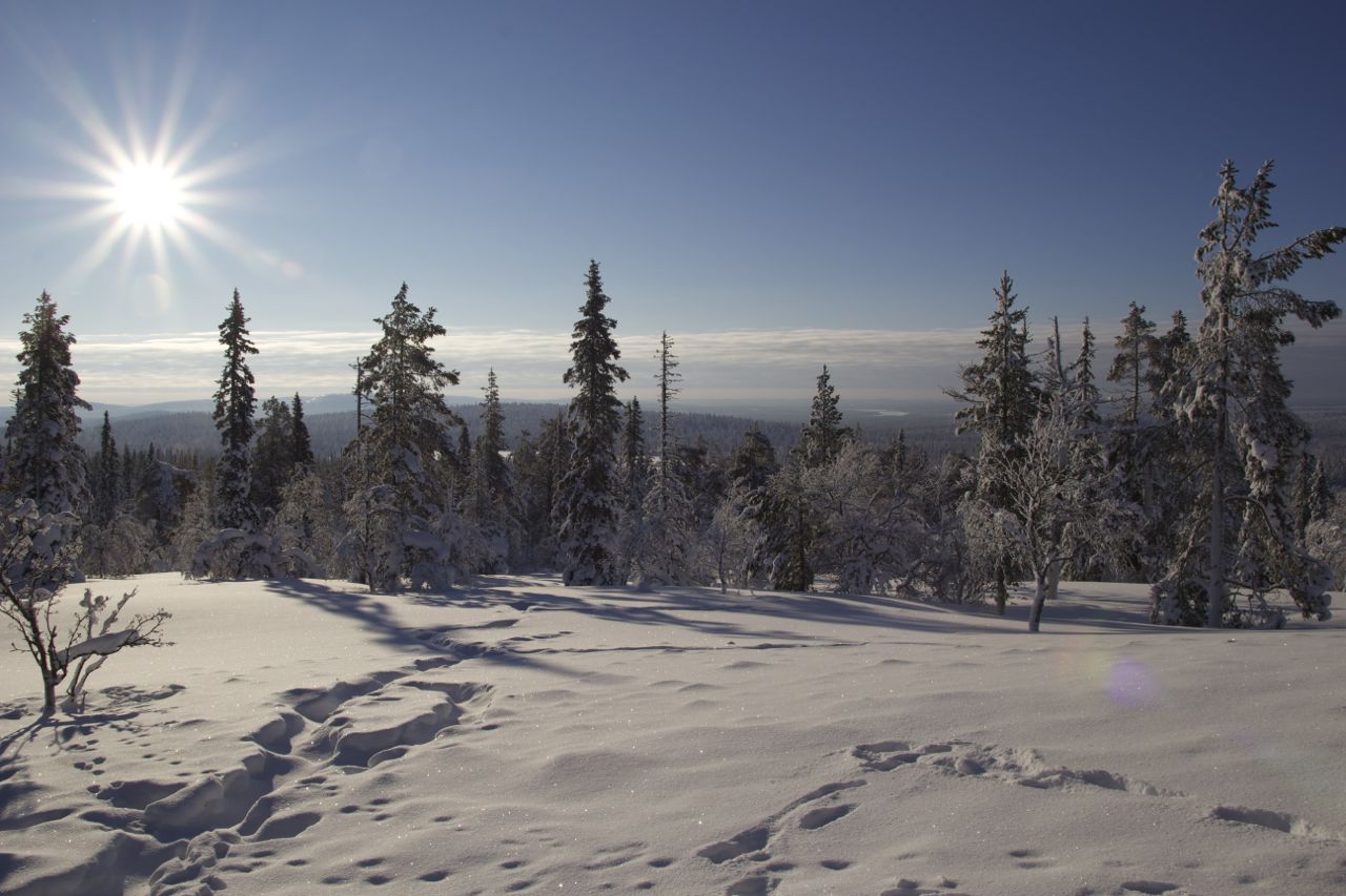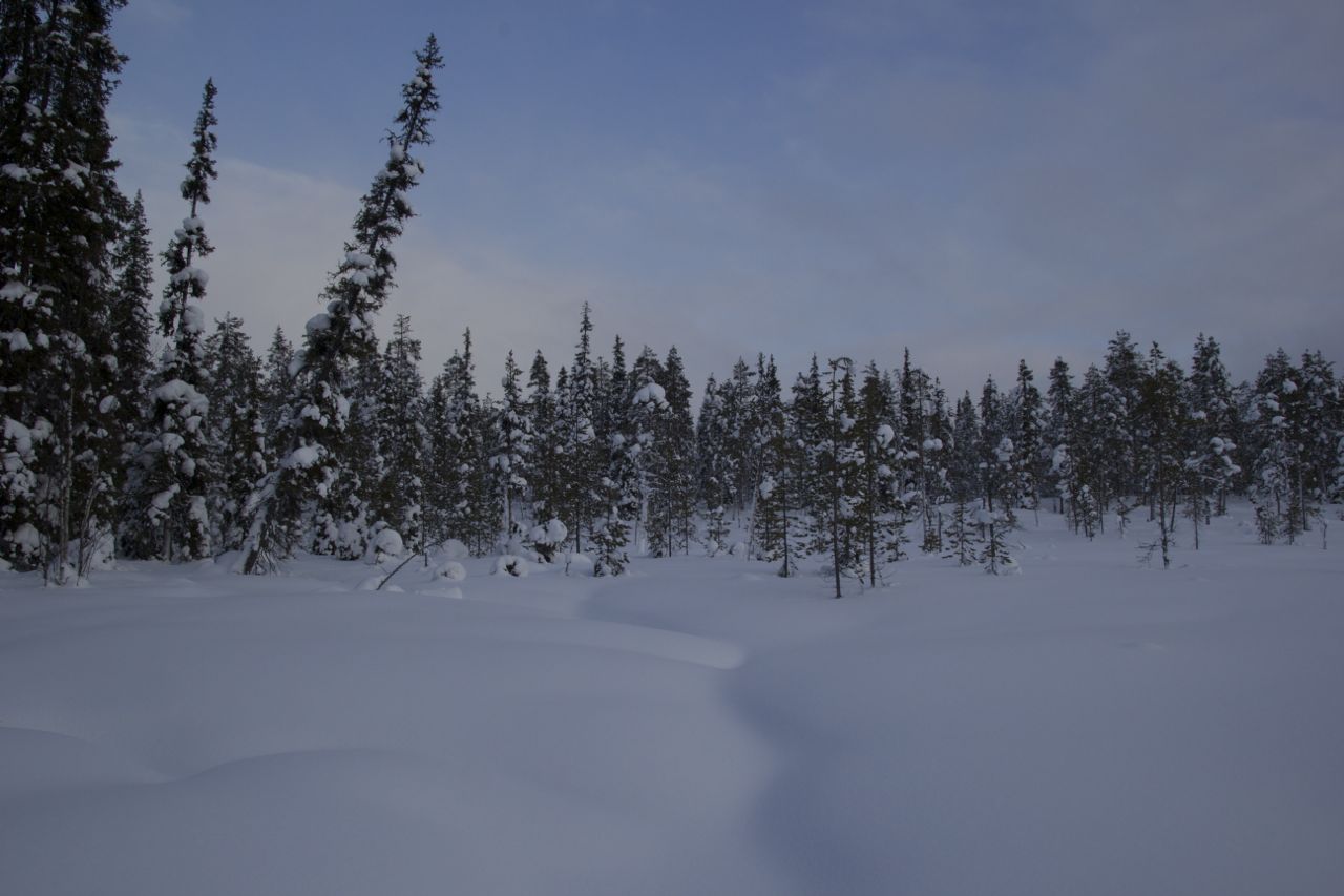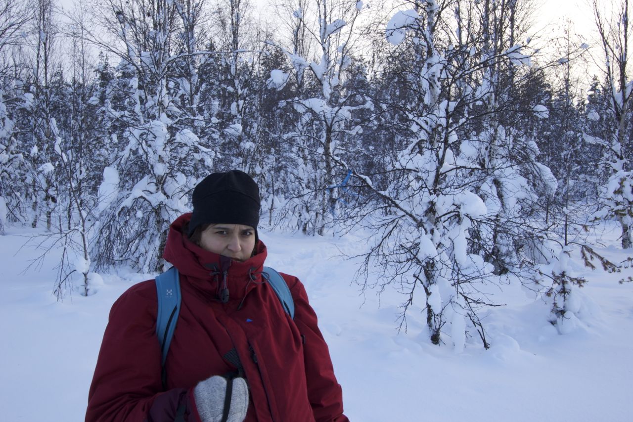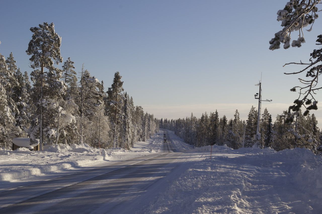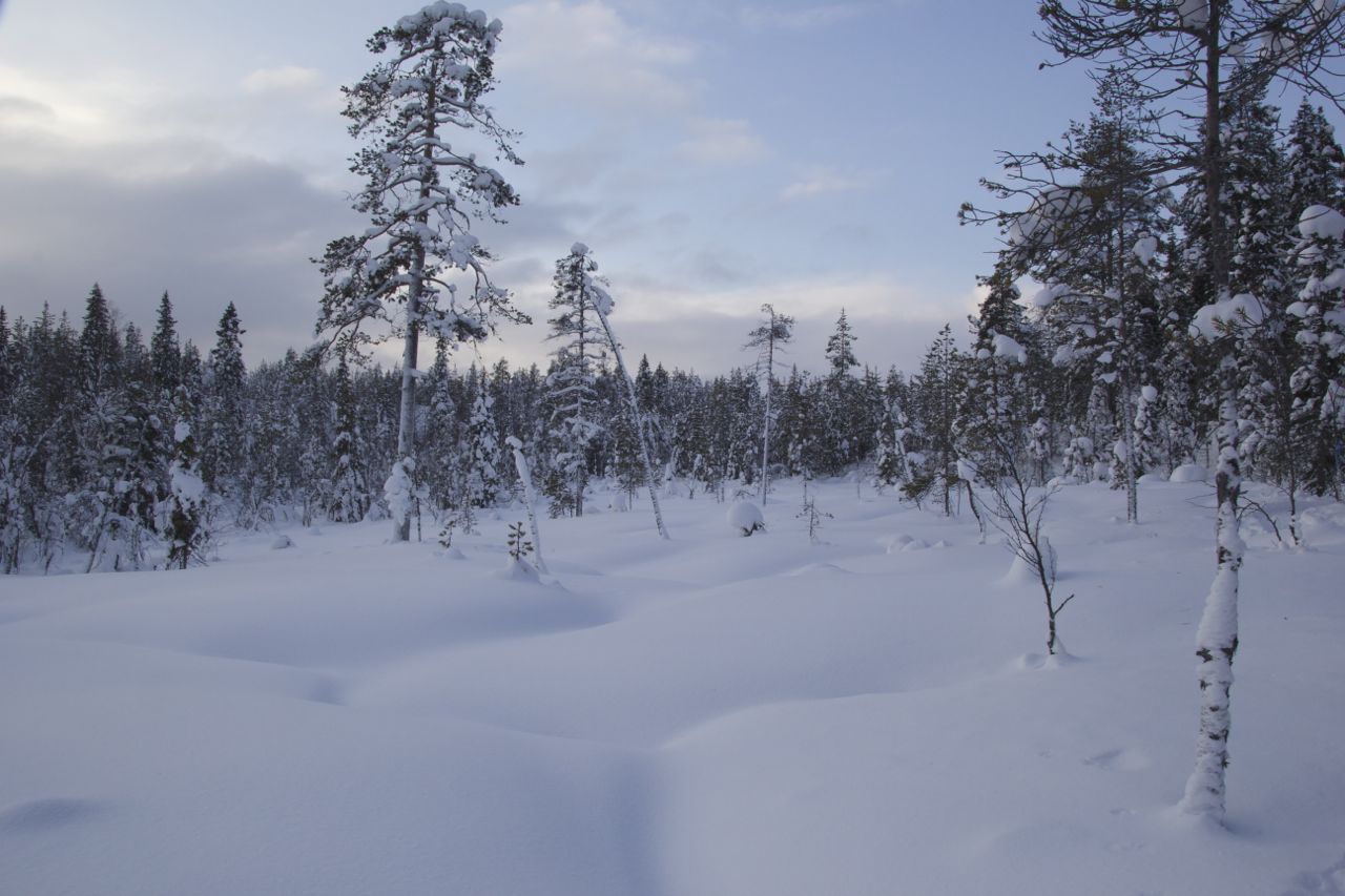Am Nachmittag parkierten wir unser Auto bei der Kapelle und machten uns mit der Langlauf-Ausrüstung auf zum See Äkäslompolo. Dieser Ort hat seinen Namen aufgrund des Sees. Das Dorf ist um den See herum entstanden und im Winter ist dieser gefroren und auf dem Eis hat es eine Schneeschicht mit einer Loipe zum Langlaufen. So fuhren wir eine Runde auf dem See. Dabei kam uns unsere Langlauf-Lehrerin von Montag entgegen und lobte uns und freute sich, dass wir nun auf eigene Faust unterwegs waren. Sie hatte heute ihren freien Tag und war deshalb draussen unterwegs bei diesem schönen Wetter, sagte sie. So schön war das Wetter nicht, so grau war es noch nie, dafür aber nur -2 Grad.