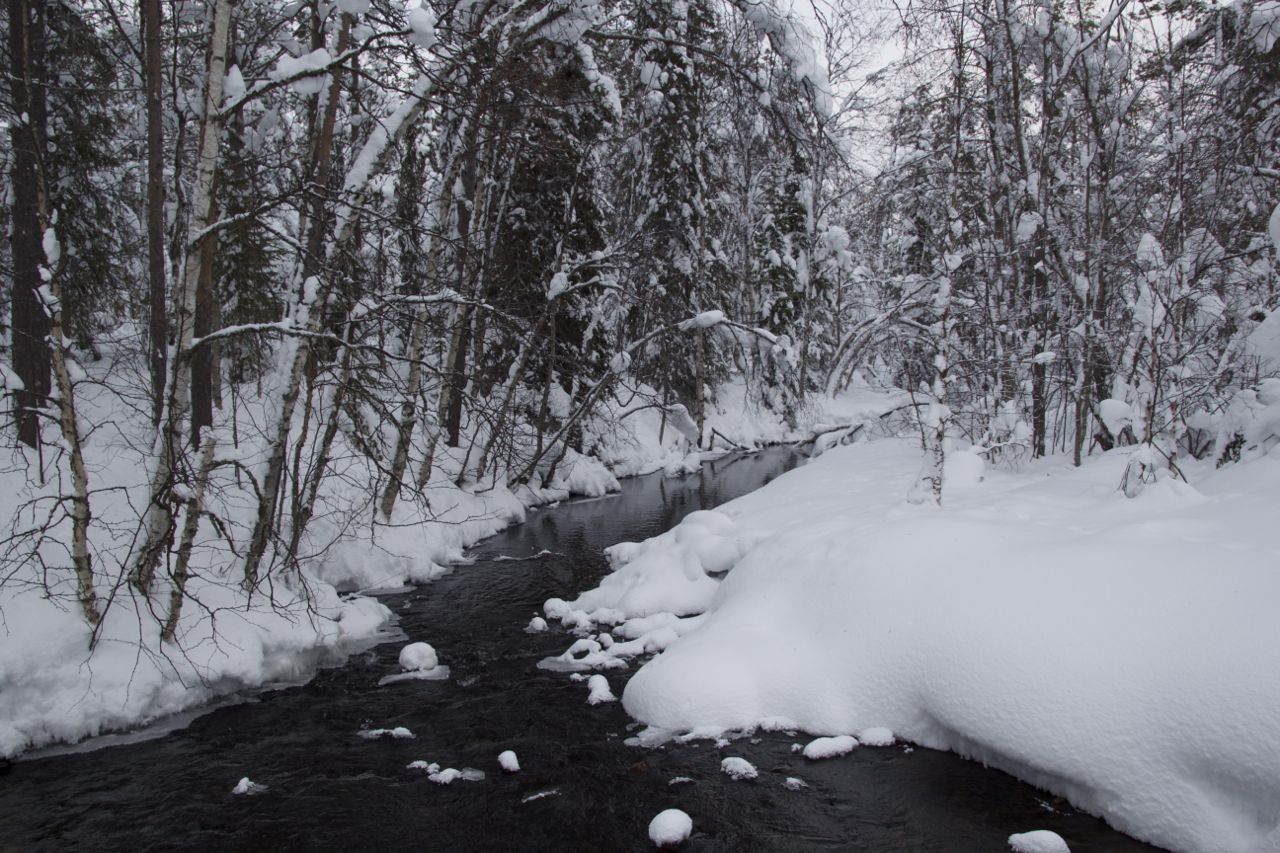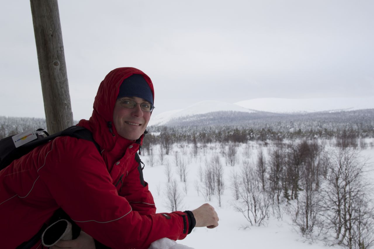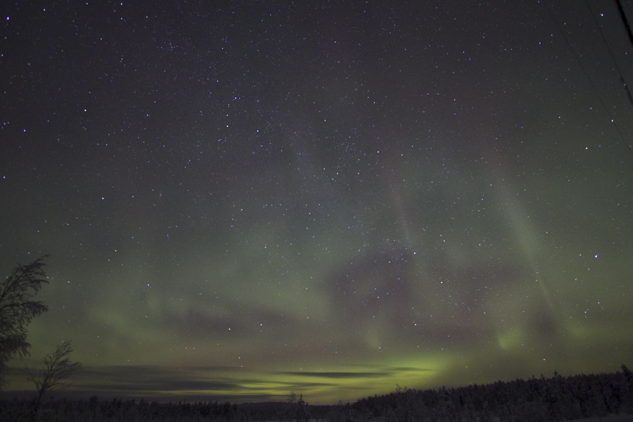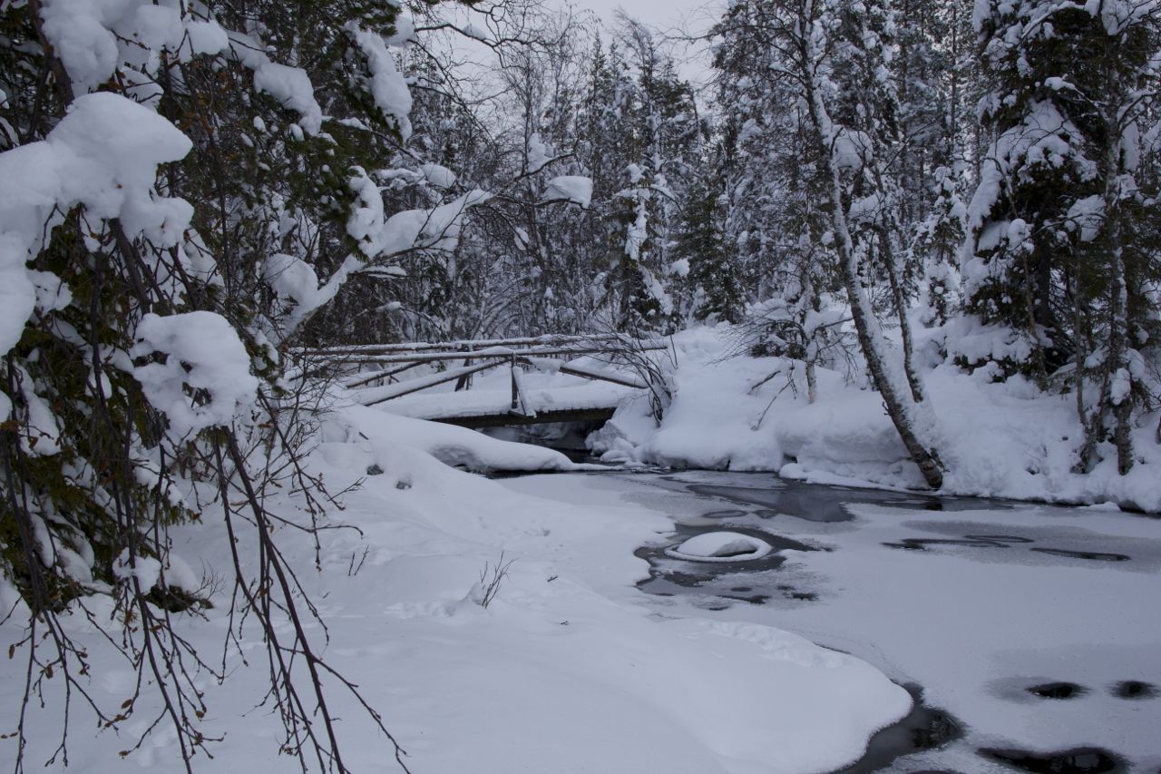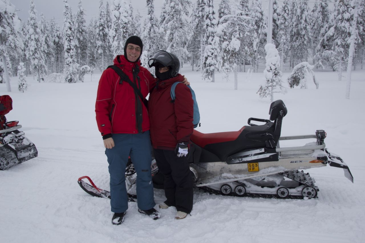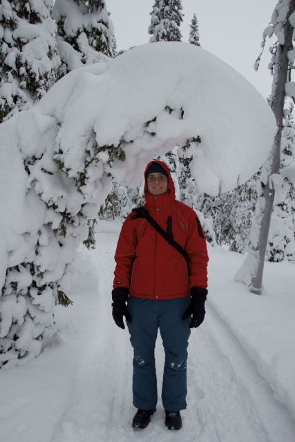 Am Nachmittag parkierten wir unser Auto bei der Kapelle und machten uns mit der Langlauf-Ausrüstung auf zum See Äkäslompolo. Dieser Ort hat seinen Namen aufgrund des Sees. Das Dorf ist um den See herum entstanden und im Winter ist dieser gefroren und auf dem Eis hat es eine Schneeschicht mit einer Loipe zum Langlaufen. So fuhren wir eine Runde auf dem See. Dabei kam uns unsere Langlauf-Lehrerin von Montag entgegen und lobte uns und freute sich, dass wir nun auf eigene Faust unterwegs waren. Sie hatte heute ihren freien Tag und war deshalb draussen unterwegs bei diesem schönen Wetter, sagte sie. So schön war das Wetter nicht, so grau war es noch nie, dafür aber nur -2 Grad.