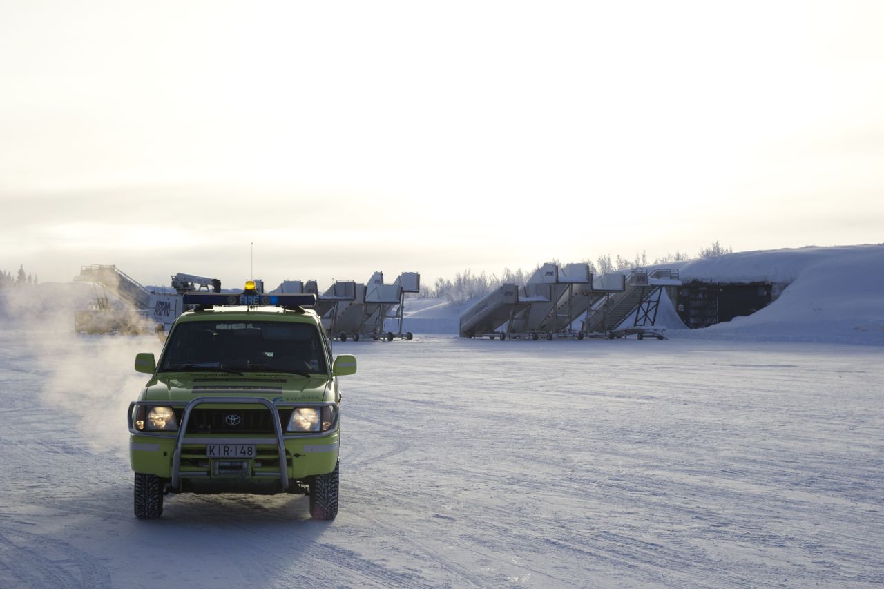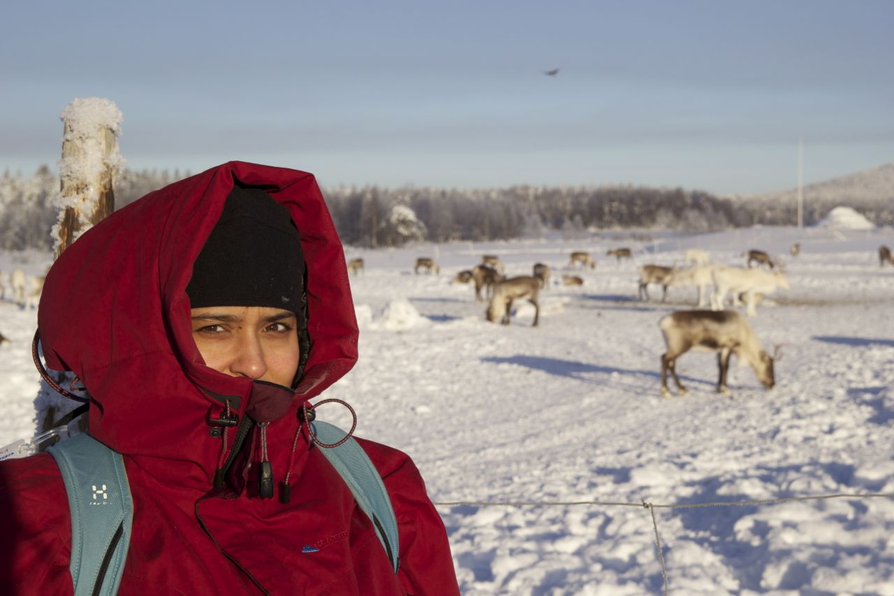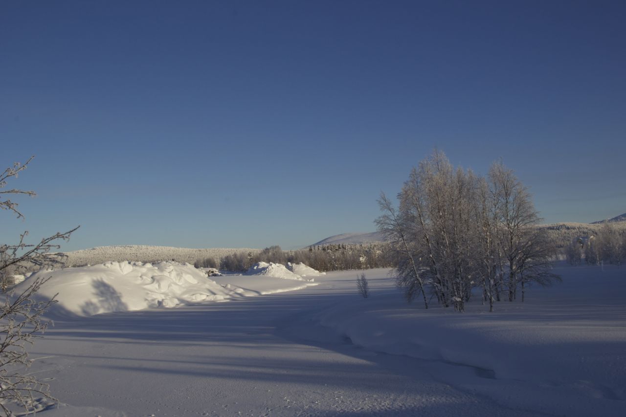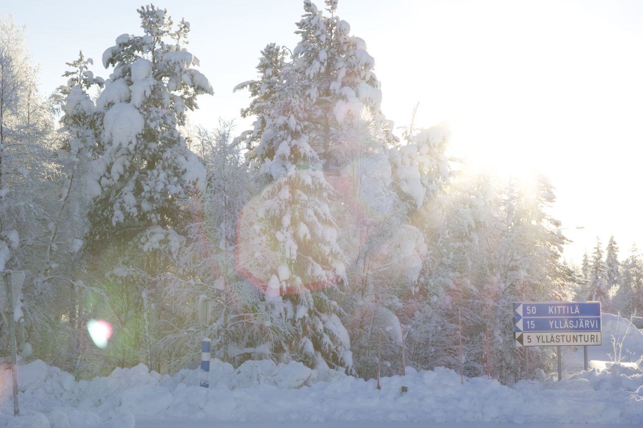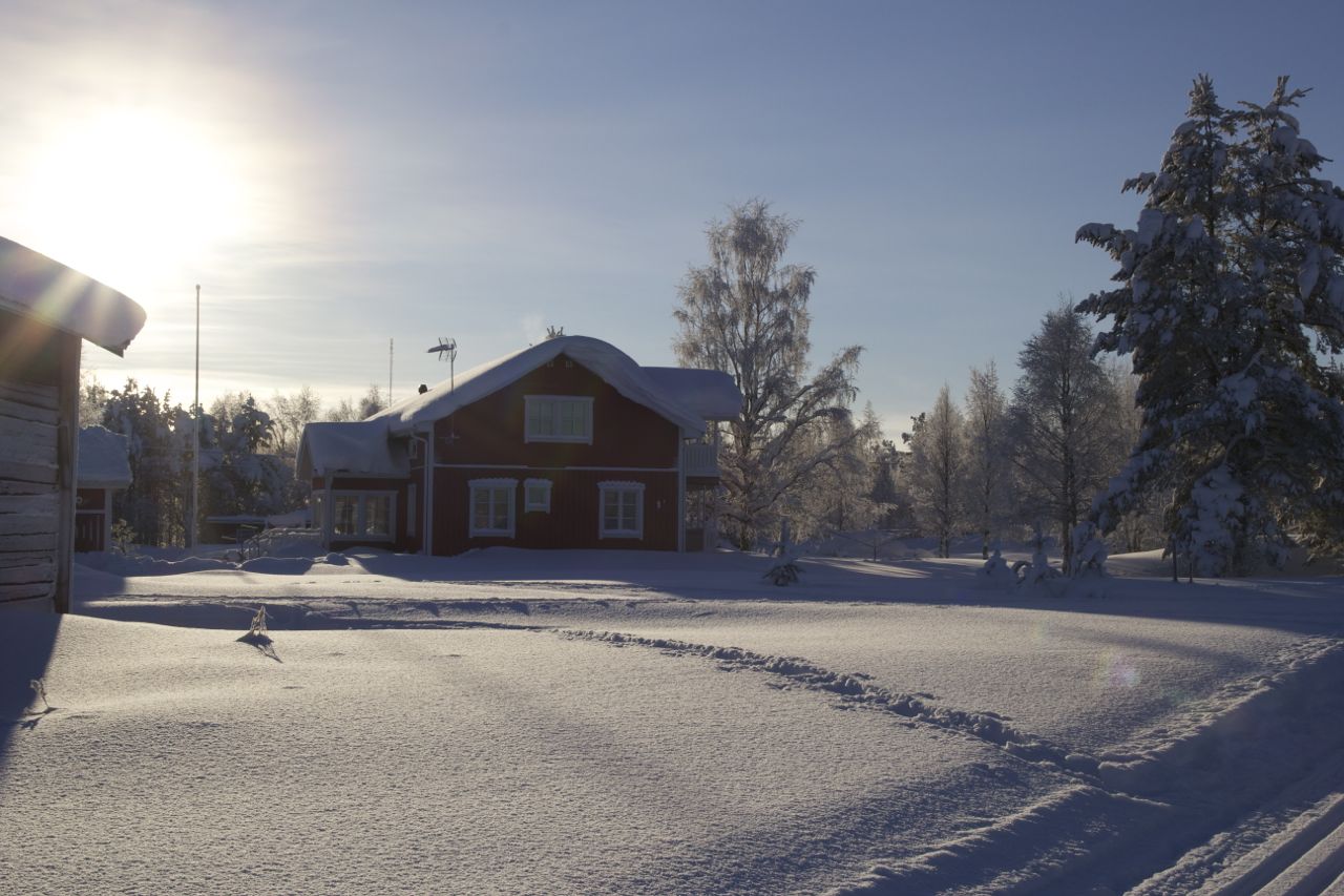 Am Morgen mussten wir nur noch unser Gepäck wieder aufgeben und den Security-Check durchqueren. Wir lasen und brachten so, die Zeit am Flughafen herum. Um 11:10 Uhr, als wir eigentlich schon starten sollten, informierte der Captain am Gate 30, dass das Flugzeug nun da sei, aber noch betankt werden müsse und dass es in Kitillä -25 Grad sei. Mit einer guten halben Stunde Verspätung konnten wir auch noch diesen Teil der Reise in Angriff annehmen. In Kitillä gelandet hiess es „Attention, it could be sleppy!“ Wir stiegen aus dem Flugzeug und waren auf dem Flugplatz, draussen bei -25 Grad und Sonnenschein. Schnell musste Marc natürlich die ersten Fotos schiessen.  Rasch hatten wir unser Gepäck und auch die Miete des Auto bei Europcar verlief problemlos. Der Zündschlüssel steckte und das Auto lief und war auf angenehme 25 Grad vorgeheizt. 40 Minuten lang fuhren wir durch wunderschöne Wälder, sahen über verschneite Felder, blendete uns die Sonne und genossen die schöne Aussicht. In Äkäslompolo angekommen, erhielten wir von Destination Lapland den Schlüssel und die Karte, auf der unser Häuschen eingezeichnet ist. Die Schneeschuhe und die Langlaufausrüstung holten wir auch noch ab. Unser Häuschen liegt etwas ausserhalb des Dorfes mitten im verschneiten Wald. Es sind zwei Häuser zusammengebaut, momentan ist die andere Hälfte unbewohnt. Als wir uns im Haus umsahen, waren wir baff. Eine gut bestückte grosse offene Küche mit Wohnzimmer,  ein schönes Bad mit Sauna und seperatem WC, ein kuscheliges Schlafzimmer und eine Treppe die nach oben führt, wo nochmals ein Sofa, ein bequemer Sessel und zwei Betten sind. Dies alles für uns zwei.